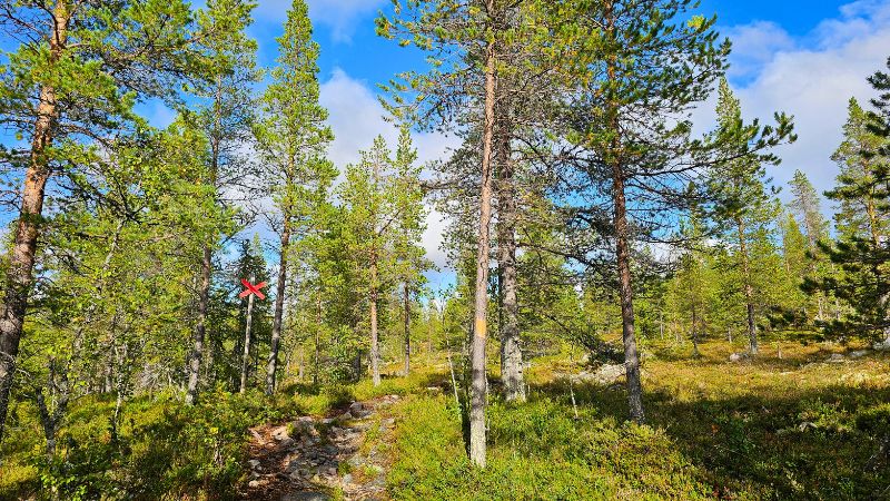 Der Weg führt zunächst durch lichten Wald. Birken und Kiefern stehen entlang des Pfades, der Boden ist weich vom Moos, und der gut markierte Weg steigt langsam an.